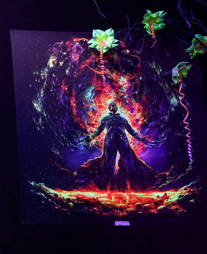 The full depth of color and luminous accents unfolds under ultraviolet light, where the image seems to come alive, shifting its intensity and structure.