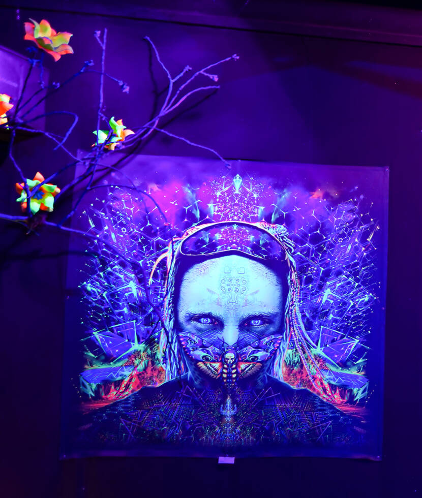 The full depth of color and luminous accents unfolds under ultraviolet light, where the image seems to come alive, shifting its intensity and structure.